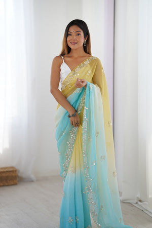 Multi Colour Chiffon Shaded Crush Sequins And Moti And Cutdana Work Saree With Blouse Piece